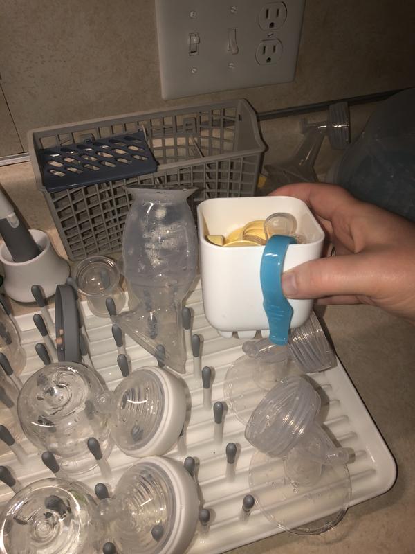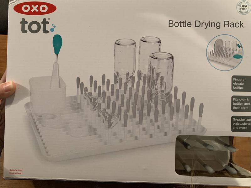 We are using the OXO Tot Space Saving Drying Rack which holds 9 bottles. Works great so far! Doesn’t take up much space and is great for tinier kitchens.”  From design-focused reviews: • It “fits at least 8 disassembled baby bottles and their components… flexible tines elevate bottles, teats and breast pump parts to allow for ventilation…”   • Another review praised its “robust construction,” “elevated design to prevent pooling water,” and “top-rack dishwasher-safe” convenience.