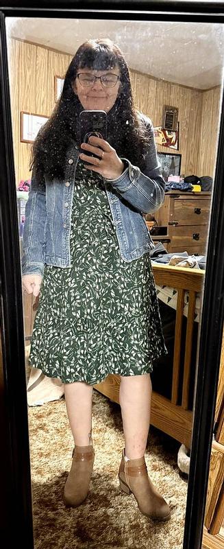 I had no idea cotton could make a material like this! I like the small floral pattern with the deep jewel tone color. It's a great fall dress because of the long sleeves and short length. I also like the type of notched cut of the bodice.