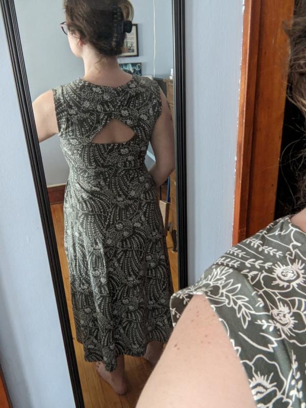 It's a lovely dress. Try XL if you have lots of curves and larger boobs. There is room for everything and the cut out in the back makes it more elegant. Could be worn on many occasions. The heavier weight of the fabric makes it more of an evening dress for me, but I live in the desert.