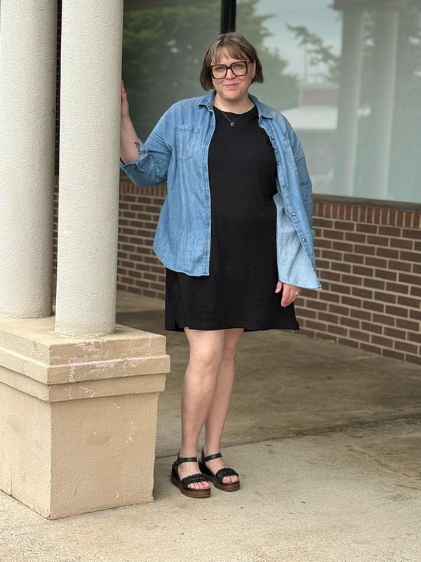 I bought this when it was final sale and I’m happy I did. I was pleasantly surprised at how cute a t-shirt dress would look. I thought it would be boxy, but it’s quite flattering, and the black makes it look chic. I can wear it many different ways, and that’s what I look for in my clothing. Cute and practical! And so comfortable; it’s a win win win!