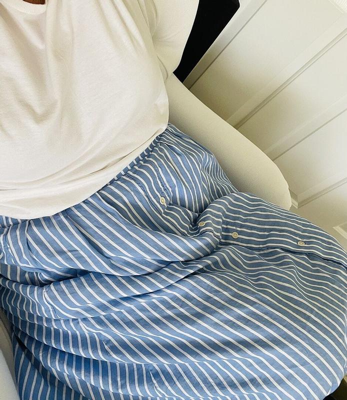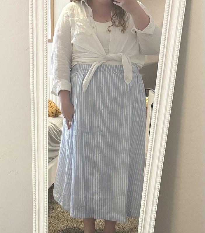 I am 5’4” and I have long torso but short legs. So the skirt looks more like a maxi than mid-calf in my body, but that’s ok with me. I purchased a size up because I didn’t know how tight the waistband was, considering the fabric does not stretch. I detest tight waistbands.