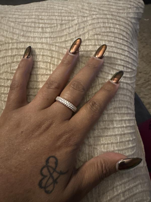 Maximize your sparkle with our Pandora Timeless Pave Double-Row Ring. With warm 14k rose gold plating, this hand-finished ring features two rows of clear cubic zirconia around the center and one row facing outwards around each side, creating a slightly rounded square profile that sparkles from every angle. Wear it on its own or stacked with other Timeless Pave rings to create as bold of a look as you want.