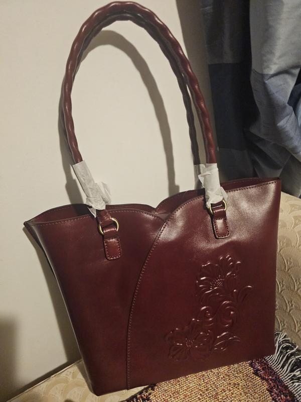 I love everything about this bag! Gorgeous color and the tooling is simply beautiful! Love the tulip-inspired shape and the back side pocket is so clever, useful and ample. It secures with a zipper. Oh, and it also comes with a tooled crossbody strap which I haven't used yet.