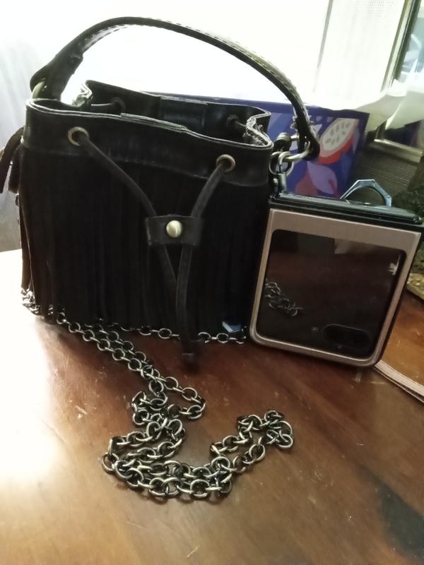 This is a well made handbag with the suede fringe, draw string closure, chain and charm makes a statement that good things do come in small packages!