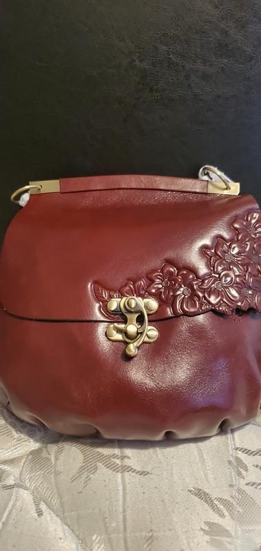 Beautiful bag with lovely detailing and color. Wish it was at least 1" bigger all the way around. The way this bag is constructed it's hard to 'stretch' open to get to inside items. I try to make it work.
