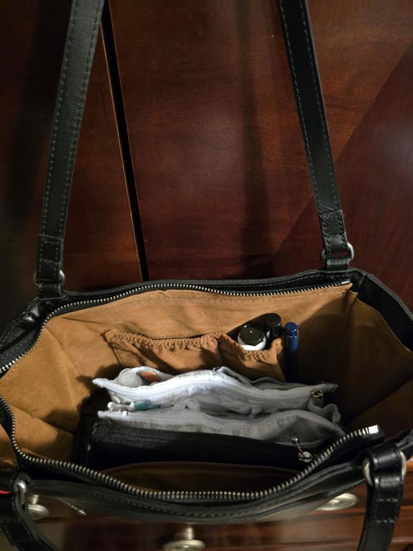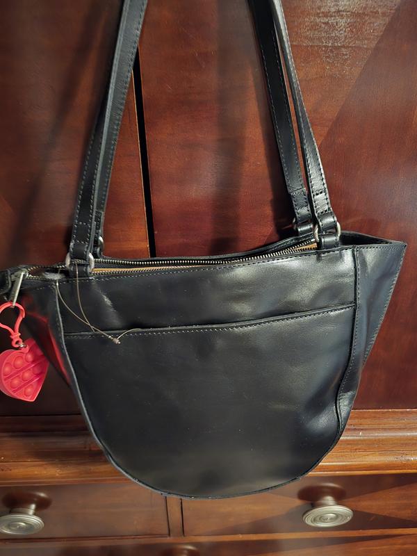 Wonderful handbag, with a unique shape. Roomy enough for my everyday items, wish the inside back zip pocket was deeper, but overall ok. Wish this color had a wallet to match or compliment