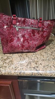 Bought this in the deep berry red. As with all Patricia Nash purses and shoes they are one of a kind and very well made. This purse is strikingly pretty and it not too big like a tote but big enough with 3 areas to separate items for an easier find. Love Patricia Nash!