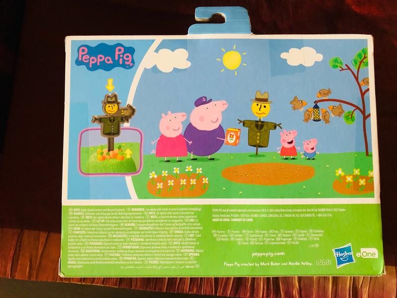 Every Peppa pig fan want toys to recreate their favorite scenes. This is exacrly what you get with this setfrom Hasbro. This 5 piece set includes Peppa, George, a scarecrow, a biahel of carrots and a wheelbarrow. You can push George or the carrots around in the wheel barrow and the scarecrow spins!ase for ages 3 and up and all part are well made and a good size so not to pose any choking hazard.