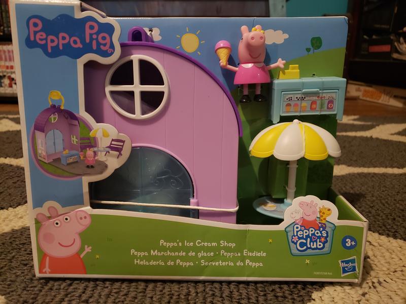 My daughter loves Peppa. This cute little ice cream shop is another perfect adidtion to her collection. Peppa can work handing out ice cream then sit and relax under the umbrella table. Then when it is time to close up shop we can literally close it up and go. Super cute.