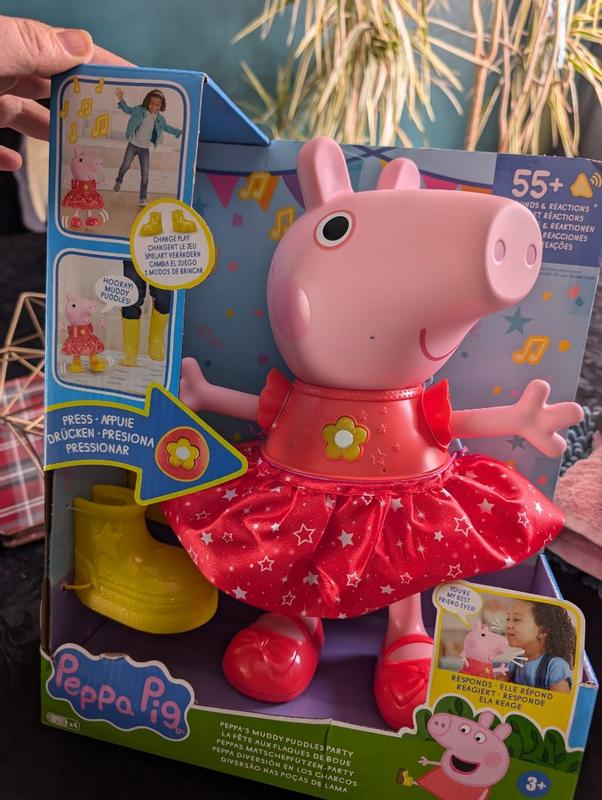 My daughter loves the Peppa Pig Muddy Puddles Party. She enjoys the sounds it make, and that she can put on and off Peppa’s boots. Peppa also knows if she’s wearing her boots so she has different responses. Its very easy to use just needs to press the button in the middle. She sings, dances, walks, talks and moves her arms. Peppa also responds when you clap or talk to it. It comes assembled.