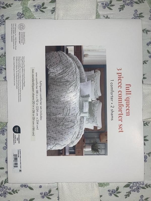 This comforter set is adorable. It's light weight for summer bedding. Also comes with 2 shams. The design fits on full or queen bed size. Washes easy and no balling.