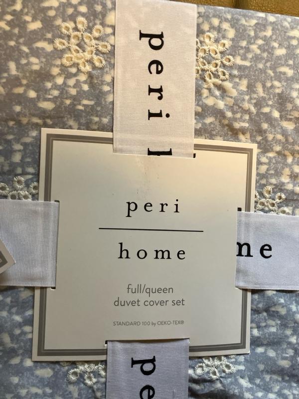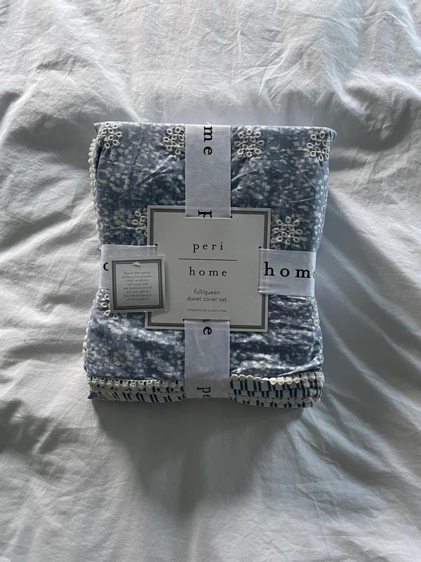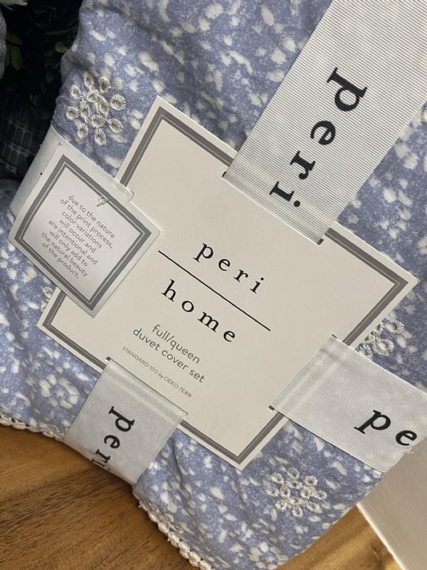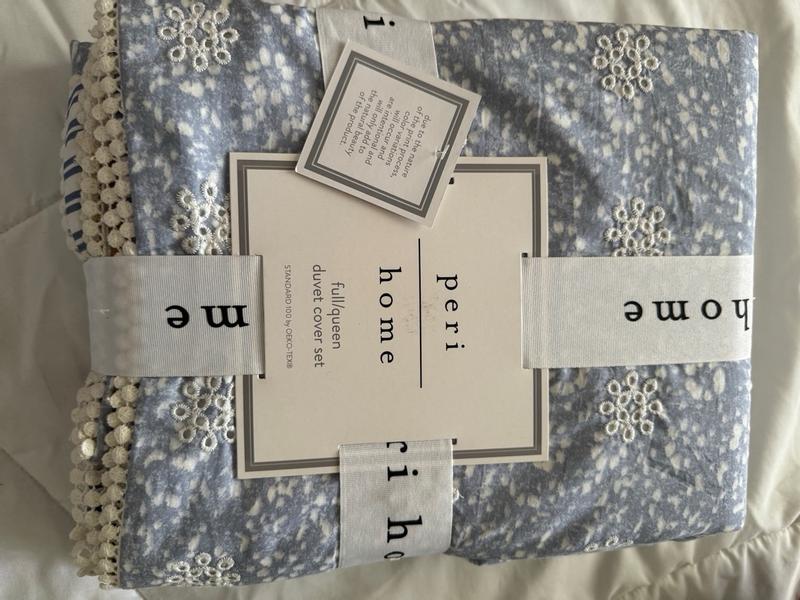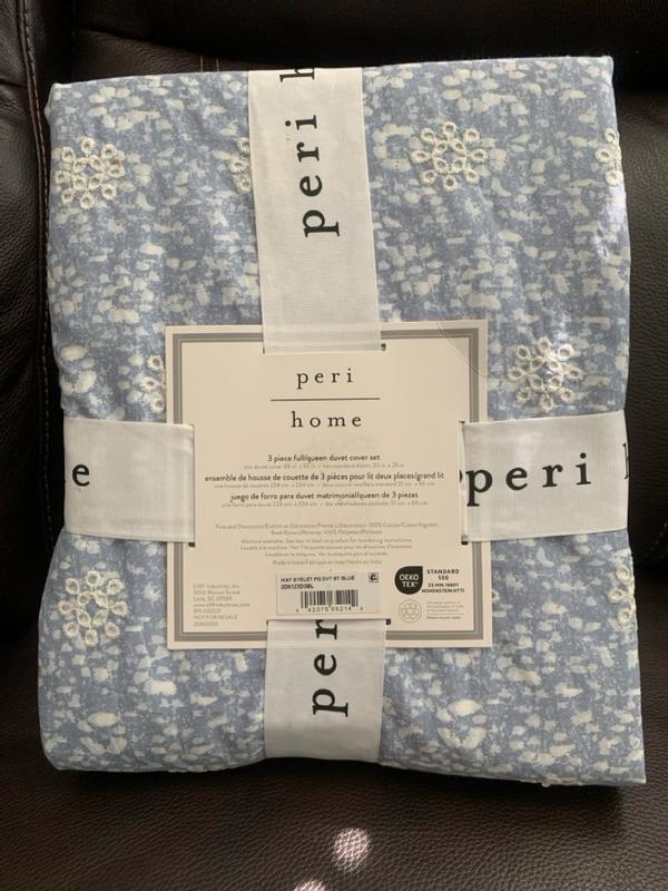 The Peri Home Ikat Eyelet Bedding Collection is a modern take on a vintage favorite. A charming eyelet in sky blue is romanced with a printed floral and reverses to a striped blue and white pattern, lending unexpected contrast. Cozy ensemble gets a whimsical touch from the pom-pom lace edge finish.