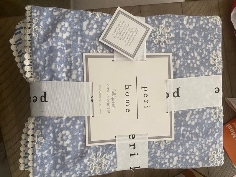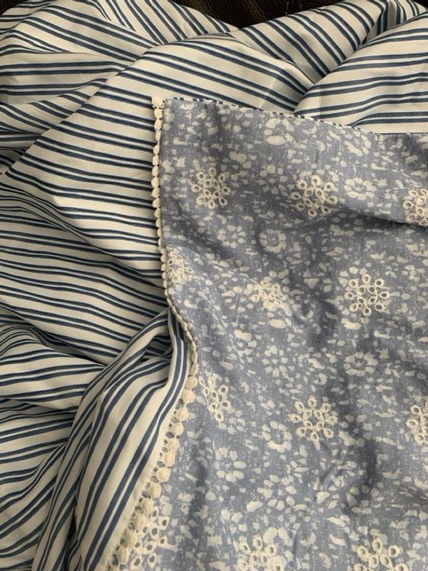 When I claimed this product, I thought it’s a full set with comforter. However, it only has the duvet cover and two shams, so it is quite a disappointment. There was either a misunderstanding or the product title was incorrect. On the upside, the design is beautiful. The material seems to be high quality and durable. The fit is true to the description. I really like the vintage feeling and the charming eyelets and the blue/white colors.