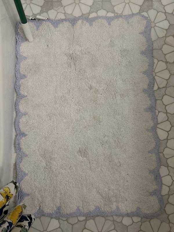 Very cute white mat with green scalloping design. Super soft and great on my feet after a hot shower. It also absorbs water well when coming out of the shower. Fits perfectly in our space.