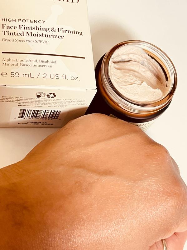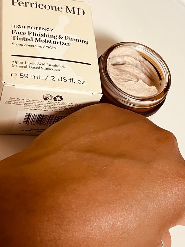 Perricone MD High Potency Face Finishing & Firming Tinted Moisturizer (30 SPF) is a lightweight, fast-absorbing, deeply-hydrating and moisturizing mineral based tinted sunscreen which provides protection from solar and blue-light (from electronics) UV rays. Having melasma and dark spots my dermatologist first and foremost treatment is tinted sunscreen. However, this one provides a dewy natural-looking luminous pearlescence, and illuminating glow unlike other hazy white film tinted sunscreens. It immediately hydrates, and begins repairing with its antioxidants such as: alpha lipoic acid, Bisabolol, which aids in reducing the appearance of lines, wrinkles and increases collagen and elastin production. Before and after shows hand scar that is quite less visible after applying moisturizer. Would recommend 10/10.