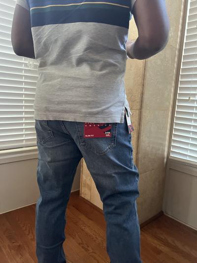 Stretchy and comfortable. These pair of jeans move with you. They have a stretchy elastic waist band that gives extra movement and room. Slim fit gives enough hip room and slim by the legs. Comfort all around. True to size but gives a bit more room when it stretches. If tight jeans is preferred these are not the right pair of jeans for you. Good for a day when extra room is needes indeed. Would totally recommend these pair of jeans. They wash nicely too which is always a plus. Hubby wears these often.
