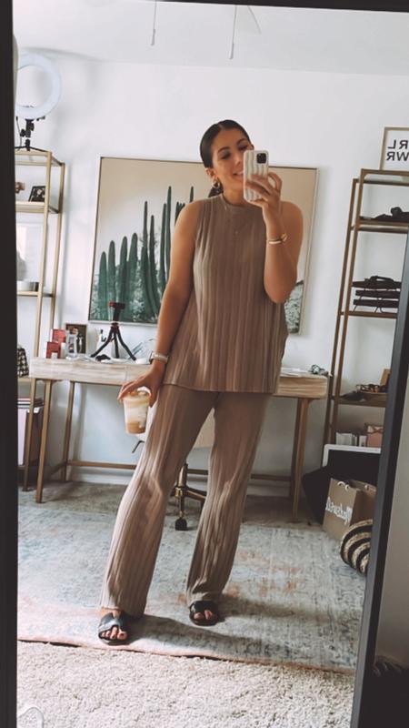 The fabric is super soft and resists pilling (a major win, since my thighs will always rub). Having the side slits in the top makes this knit set more breathable, great for car rides. The waist band might be a bit snug (still elastic, but resistive).