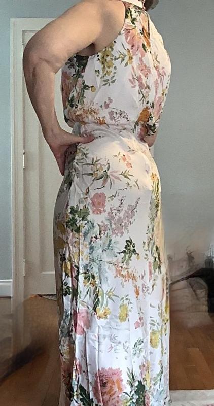 I LOVE this dress! It hugs in the right places and is loose in the right places. The fabric is satin and looks very classy. The high neck is beautiful. I’m very happy I purchased this.
