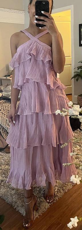 I got this as a bridesmaid dress for a spring wedding and it’s a perfect fit all around. The color is something between a pretty mauve pink/lilac. The dress does not need altered at all, I’m 5”1 and it hit me right at the ankles, zips up comfortably and still outlines my shape- I was worried it would hang on me considering the style but it is flattering! It’s not heavy at all and the straps around the neckline are comfortable considering they form into two straps on your back. The only thing to note is the material is a bit subject to wrinkling so keep that in mind if traveling with the dress! Overall very happy with this purchase!