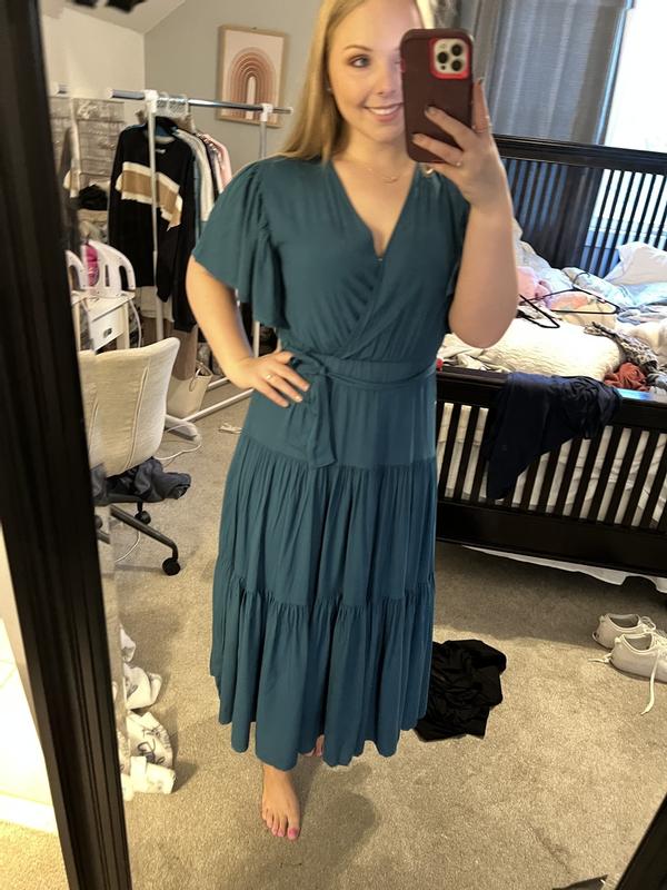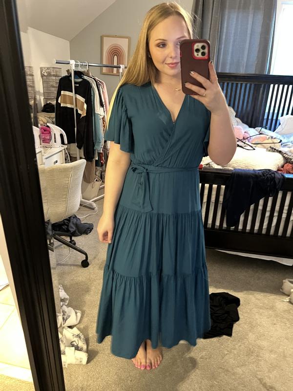 This dress is beautiful!! I ordered a large & it fits great. I’m 5’3, 170 lb. I wear a 12 or 14 depending on the fit. This dress came super wrinkled but once ironed out, it’ll be great. The fabric is soft yet sturdy. The material feels cool to the skin. I love the flow of the skirt and the color is a gorgeous teal