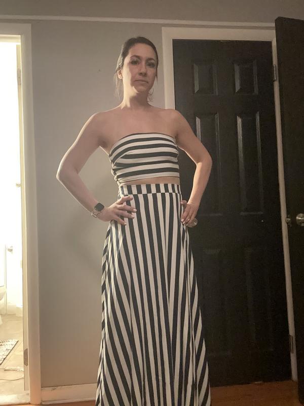 Love the 2 piece set! It barely shows and mid drift when it’s on. The skirt is zippered and fit well. It’s higher waisted. It looks good on! Love it and perfect for a summer night out.