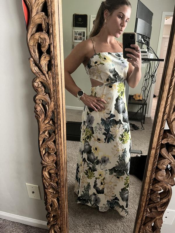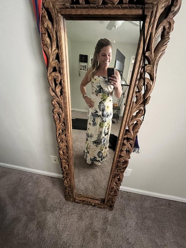 This is very flattering on. Colors are beautiful and love the cutouts on the sides of the dress.