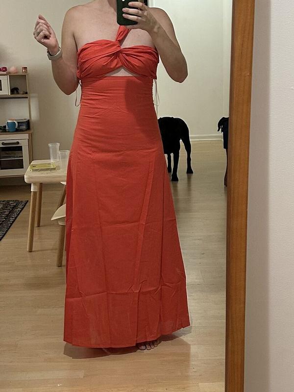 I really love this dress. It is a bit complicated to figure out tying, definitely need someone to get dressed with. It is too small for me right now, I’m hoping it will fit when I need it in a few months time. If you are between sizes, definitely size up. Fits well in the bust but the waist is quite small and not at all forgiving! I love the fabric, great for hot weather.