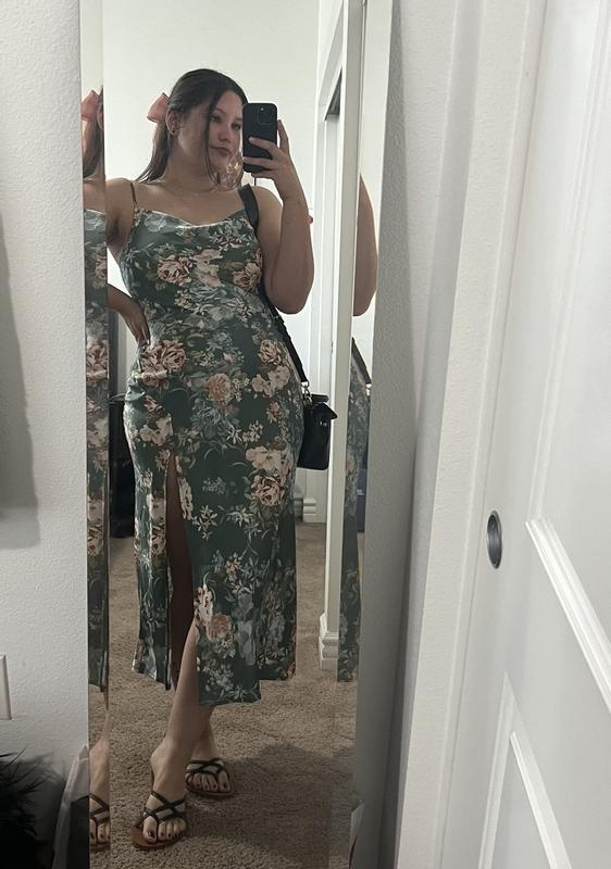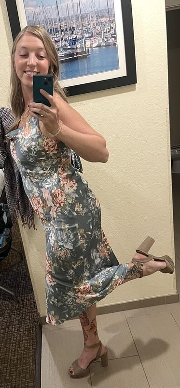 Make a statement for your next special occasion in this stunning midi dress! Featuring a cowl neckline, thin adjustable straps, satin sheen feel, and a beautiful floral print, this dress is sure to turn heads.
