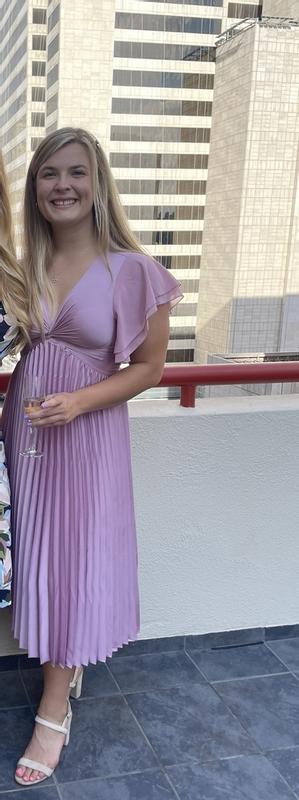 Dance through your day with our chic midi-length dress featuring a fun V-neckline, charming short flutter sleeves, and an invisible back zip with a sleek hook and clasp. A drop tier pleated skirt design that'll make you want to twirl from daybreak to nightfall.