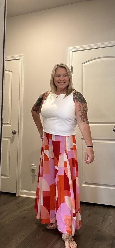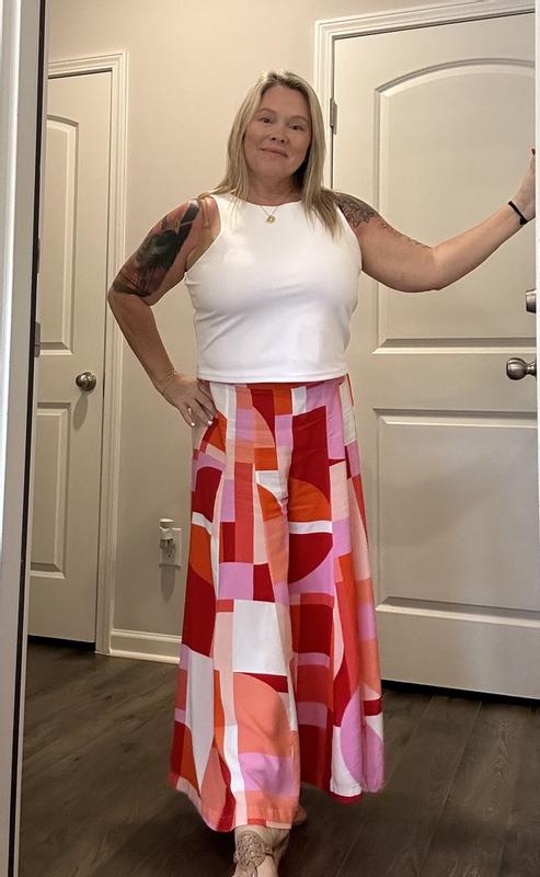 I have never purchased a palazzo-style pant in my life. And I have never even *tried on* a pant that was t a solid color. I couldn't imagine it working on my short, curvy frame. Then these pants came into my life and I'm floored! The flat front (no pleats, no ruffle, no tie) is a game changer, as it add absolutely no bulk to my waist or tummy. And then, like a flowy dream, it just falls perfectly down my short and curvy legs. The back doesn't cling to my butt but just drops down as though I'm wearing a long skirt. The length is just slightly too long for my 5'2" frame but I also don't wear higher heels or wedges very often so I'll hem these just a bit so I can wear with my sandals. The material is smooth and light. The colors are a dream!