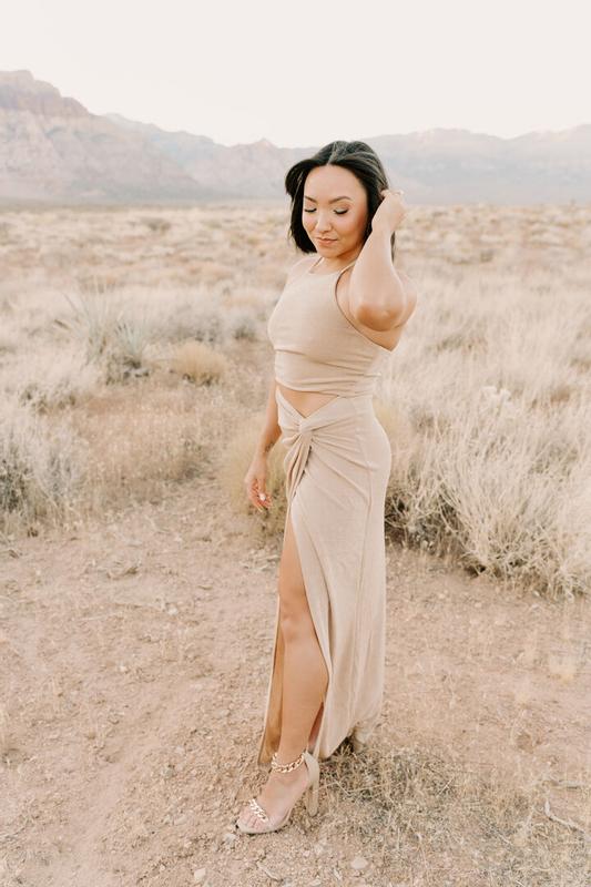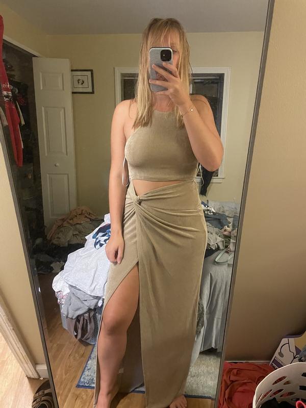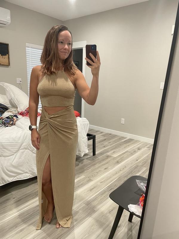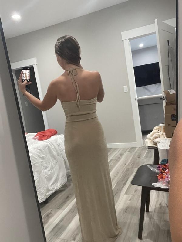 I wore this dress to my bridal shower and it struck the perfect balance between sexy and chic. The slit showed just the right amount of leg—elegant without being too revealing. The champagne color looked stunning, especially with a bit of a tan. I’m 5’7”, 147 lbs, and went with a size 4 (one size down from my usual), and it fit like a glove. I can’t wait to wear it again!