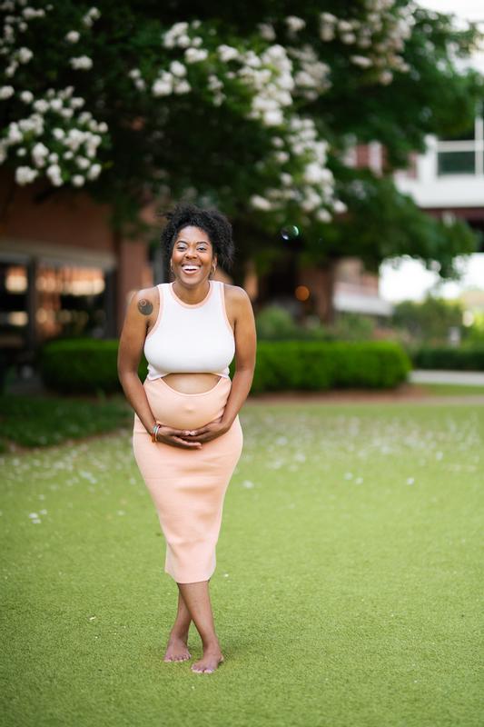 Wore this dress to my baby shower at 34 weeks pregnant. Dress has plenty of stretch to accommodate growing bump!