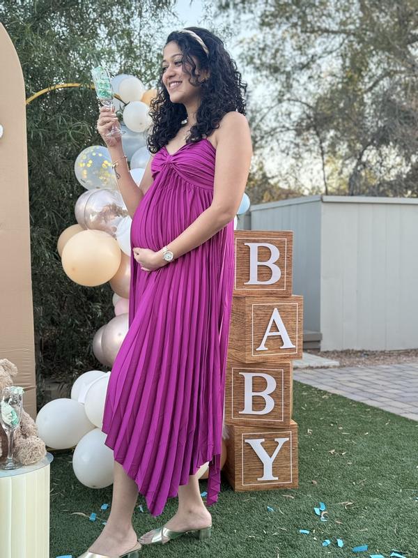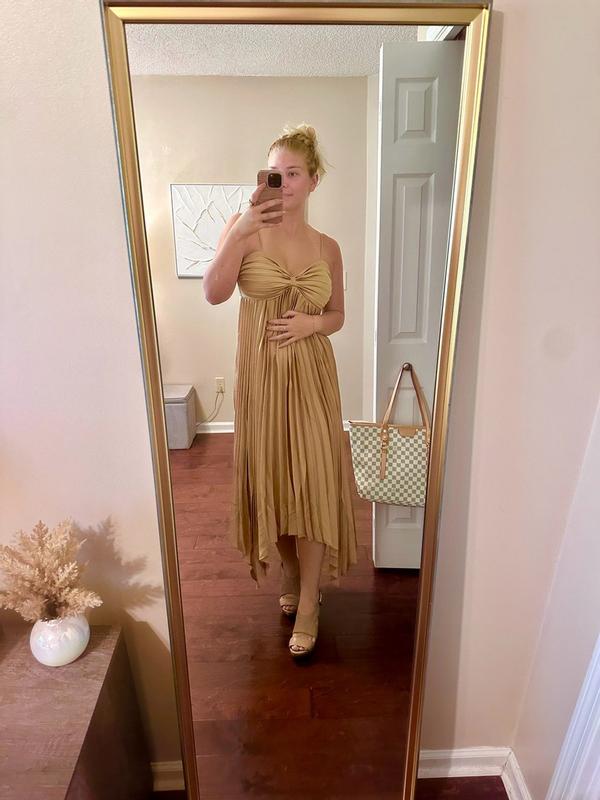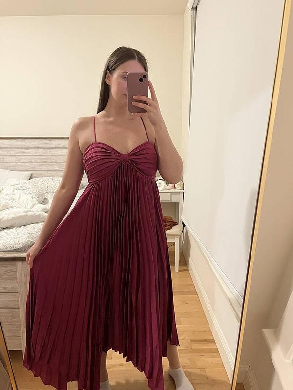 Beautiful dress. Keeps its pleats very well. Versatile. Can be dressed up or down. Comfortable and with adjustable straps. Beautiful color.