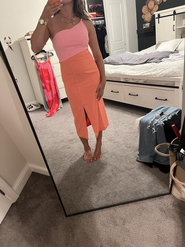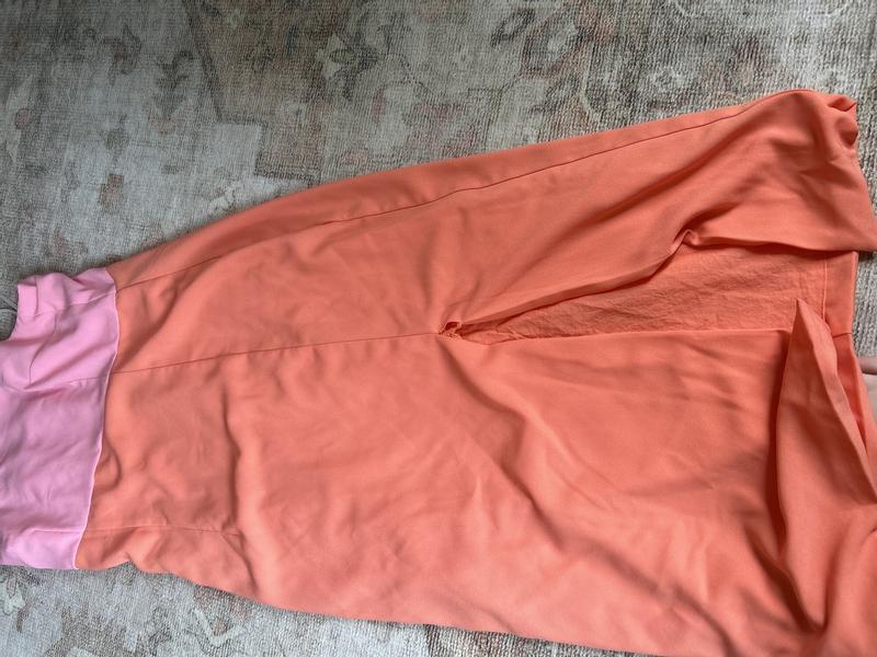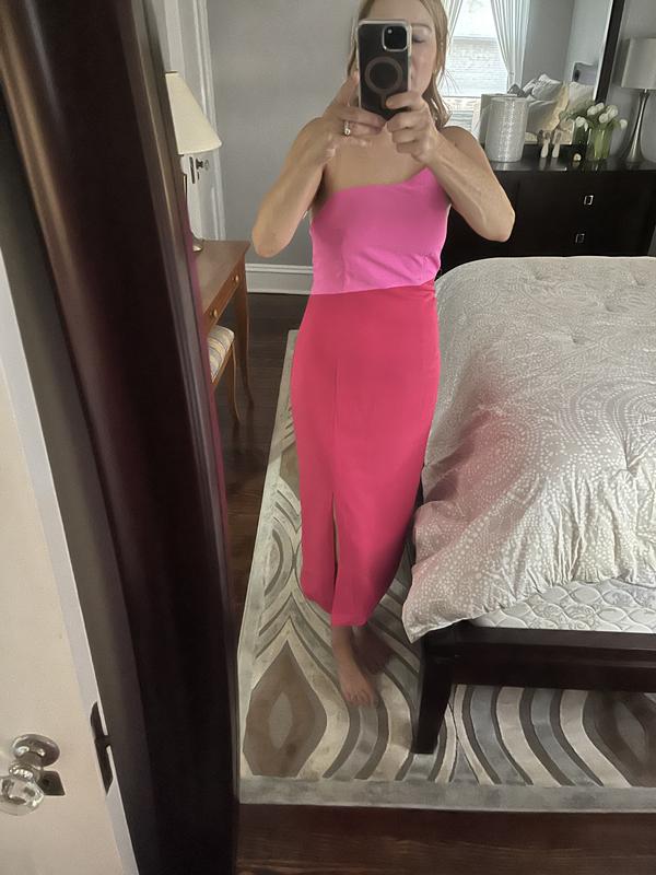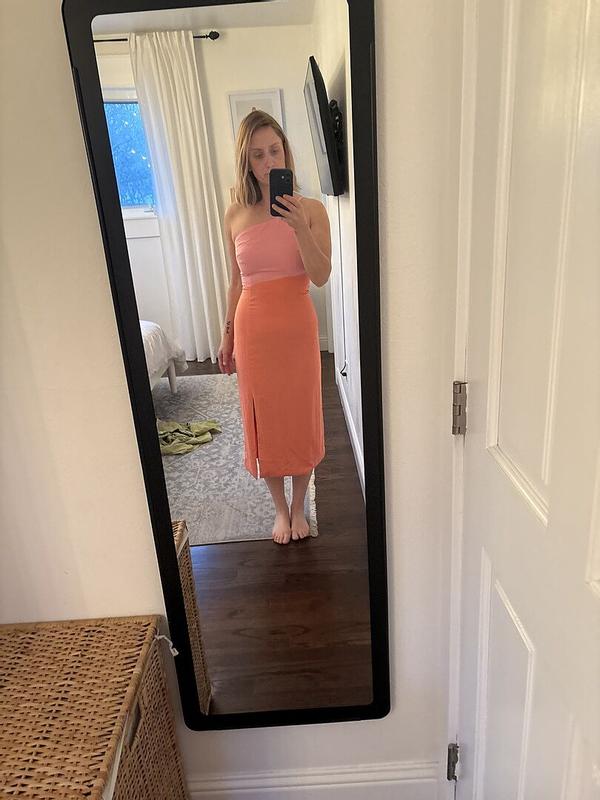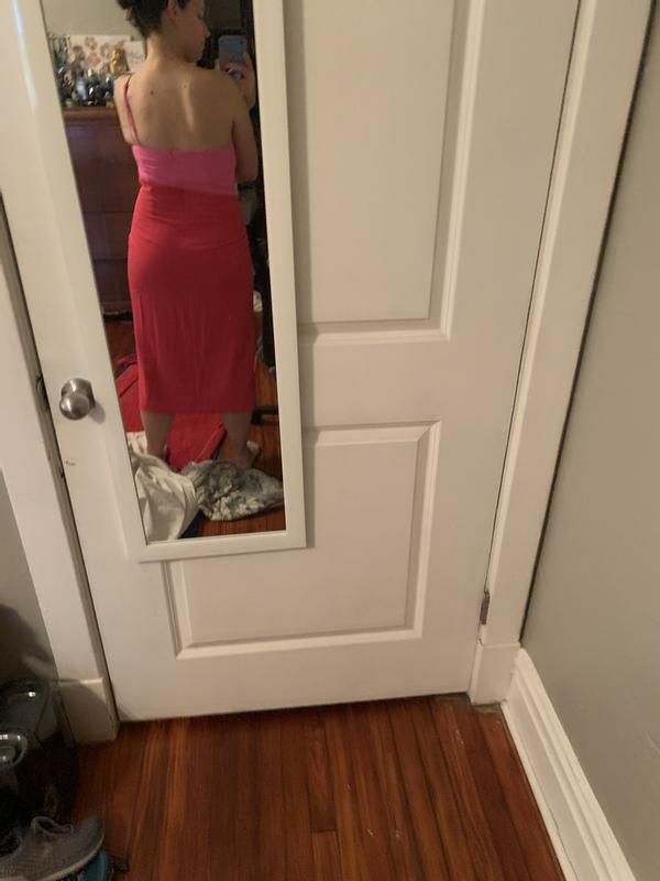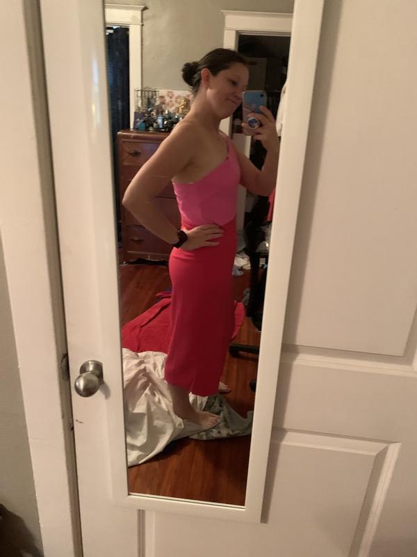 This dress is gorgeous! I wore to a beach wedding rehearsal and got so many compliments. It fits snug so I sized up after reading other reviews and am glad I did. The only downside in sizing up is that the top was a little loose on me, but my chest is a little small. I was hoping to wear without a bra but wearing a strapless bra helped it fit better. It’s very flattering, especially the diagonal color block. Highly recommend!