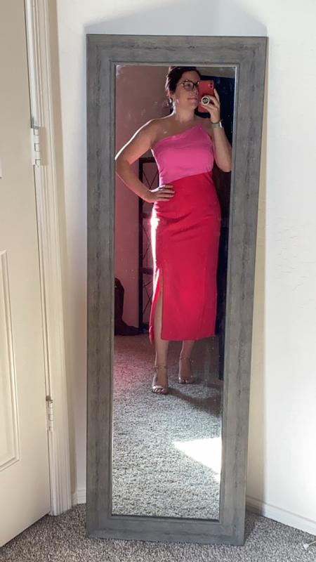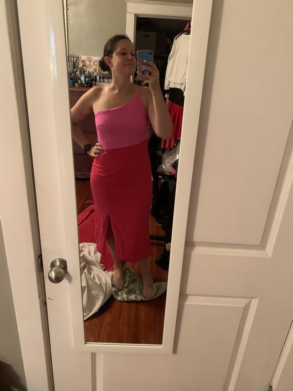 This dress is very flattering with its on shoulder strap and block colors. However, it runs small. I originally ordered a size 6, swapped for an 8 which was still tight to the point it’s uncomfortable to sit down in and the slit seam is at risk of splitting. Maybe a 10 would work but I’m guessing it would be too big on top and it’s too late to return. 😒