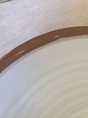 Edges are not painted well, some have spaces with no paint others are faded. I am returning the three sets that I bought. All the boxes had pieces that were not well painted. I am very disappointed with the quality of Pfaltzgraff. I bought a set years ago and it was perfect. Now they are worst that cheap plates you can buy at the dollar store!