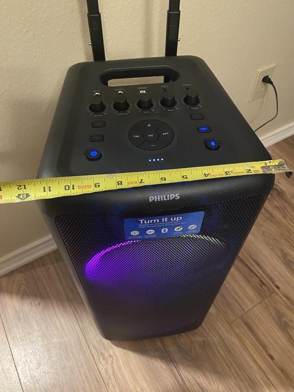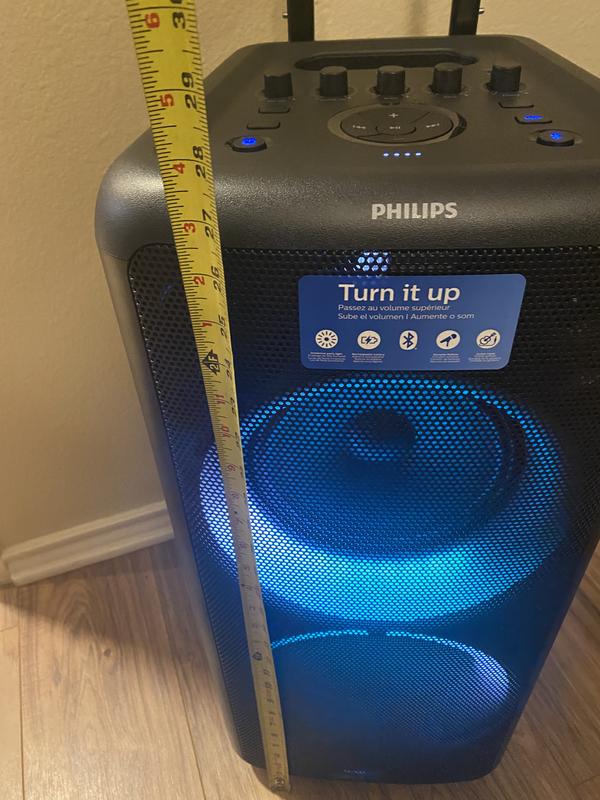 Philips Party Speaker is a lot bigger than what I imagined. I love it so much and its just what I have been looking for in a speaker. The quality of the sounds is perfect and loud just like I wanted. My family loves karaoke and we have the best speaker for everyone to go around and sing there hearts out. The battery life is great and lasts up to 14 hours. I love that we can roll it anywhere after it is fully charged. My kids hook there phones to them and listen to the music in there rooms. The bluetooth option is great and we all love it. I can't wait to take it on our late night BBQ get togethers and have fun dancing around and the bass just pounding and loud. I let my daughter borrow it for my grandsons birthday party for a small gathering and everyone was very impressed how loud and mobile it is. I recommended it to everyone and we all love it. The handle and wheels are a plus and we don't have to carry it around we can wheel it around. The inputs are great, including the controls and also for guitar hookups which is perfect when I am around family because they love to play the guitar. The volume control gets it to where if we want it soft or loud and great for when we are just home and want to listen to music not so loud.