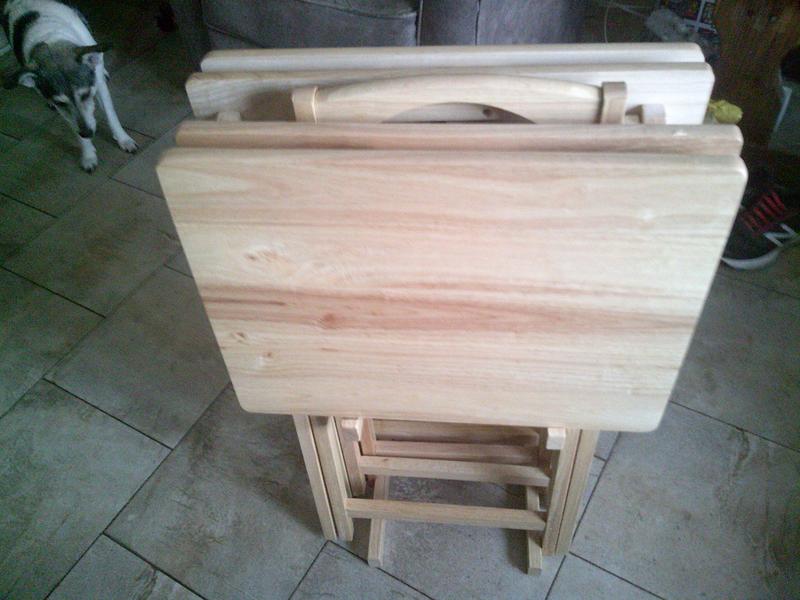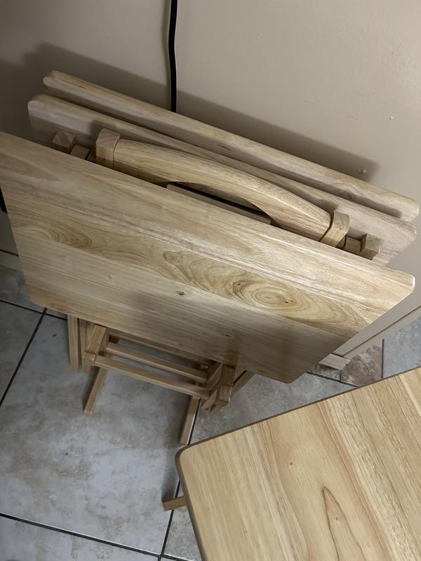 I have been looking for a tray table set for a while and wanted one like the one we had growing up. This one fits the bill. I love the wooden color and I also like that there is a string/rope that keeps the table from flopping all around. I also like that it comes with a stand.