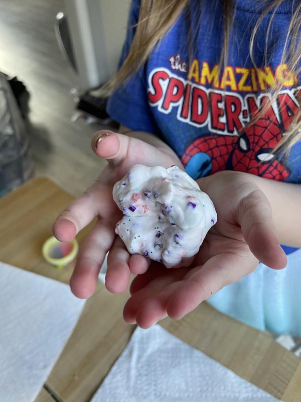 We had a blast mixing this playdoh. The cloud stuff has a nice, airy texture that was kinda slime like, but not really. We got two colors of glitter, 5 different kinds of playdoh, some sprinkles, and two colors of metallic confetti. The whole family joined in making these. Now I have them at my desk to squeeze on during meetings.