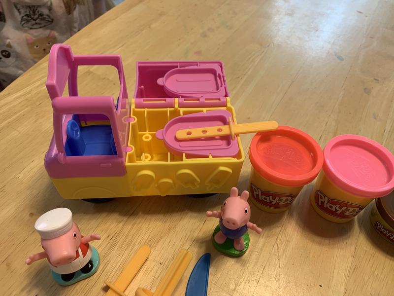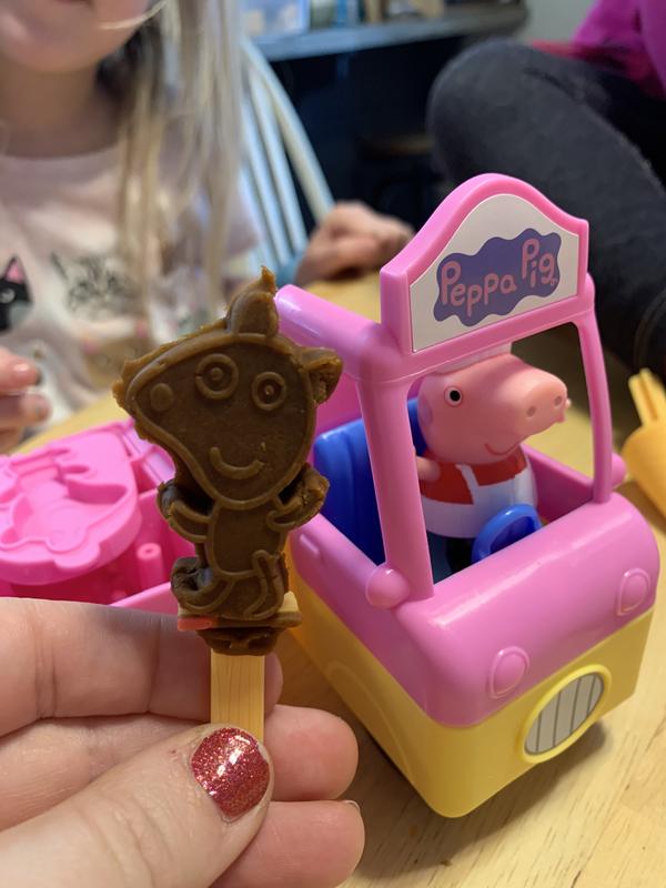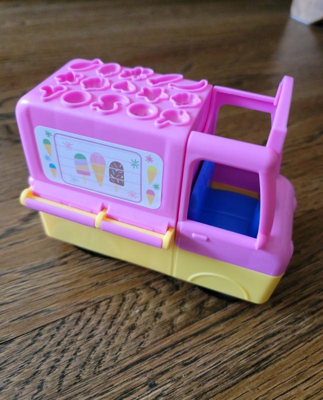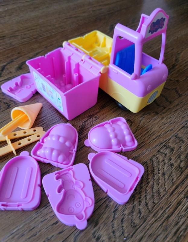 This Play-Doh Peppa Pig ice cream playset comes with 2 "popsicle "sticks, 1 cone and 3 popsicle molds. The ice cream truck rolls nicely,and on the top it has such cute little fruits and animal shapes to decorate your treats! I like that you can store the molds in the truck when not being played with. This would make a great present for any Peppa pig fan!