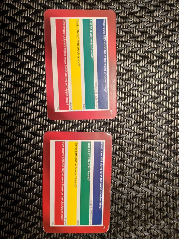Had duplicate cards in the deck, as well as cards that weren't complete. For instance, asking about a product in picture ""C"" when only provided with pictures ""A"" &""B"".