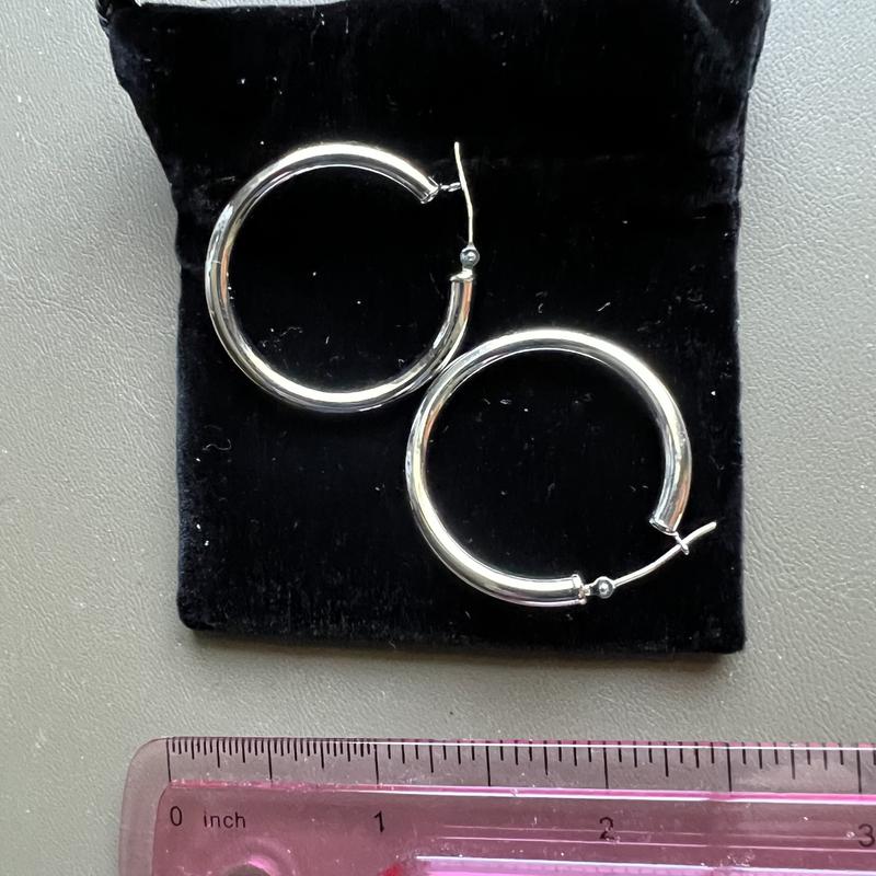 These are beautiful 14K white gold hoops and they are a gift for my daughter-in-law. They are a nice size but not too large and are well made.