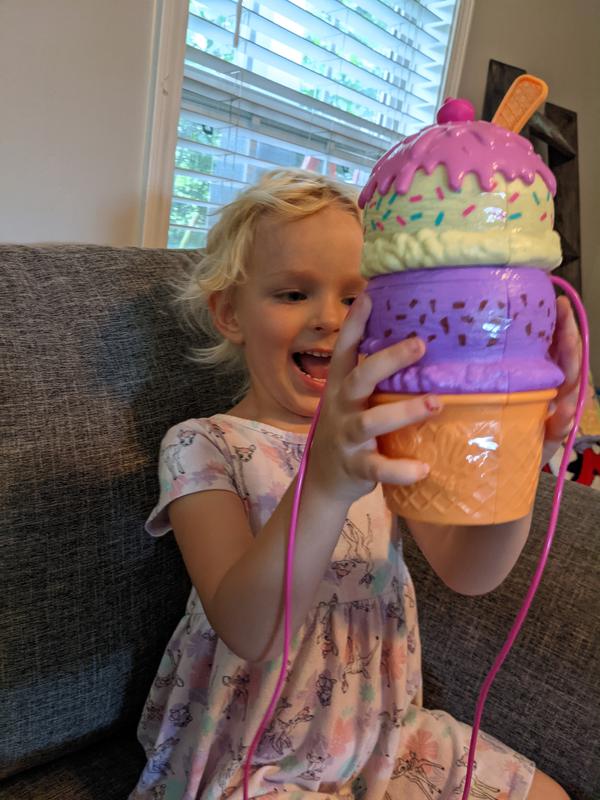 My daughter loves this icecream cone looking toy she takes it everywhere she goes. I love that she can wear it as if it was a purse and its not big enough to take up much space or room its travel size and keeps my daughters entertain