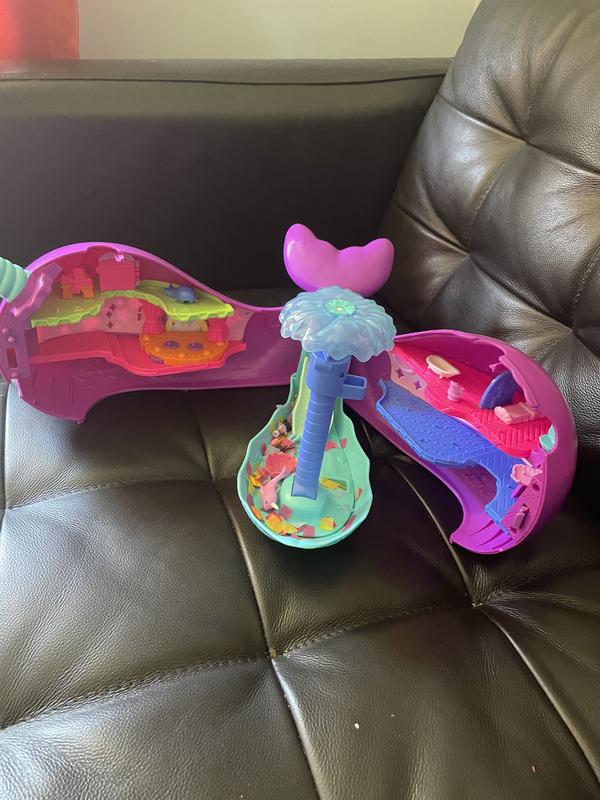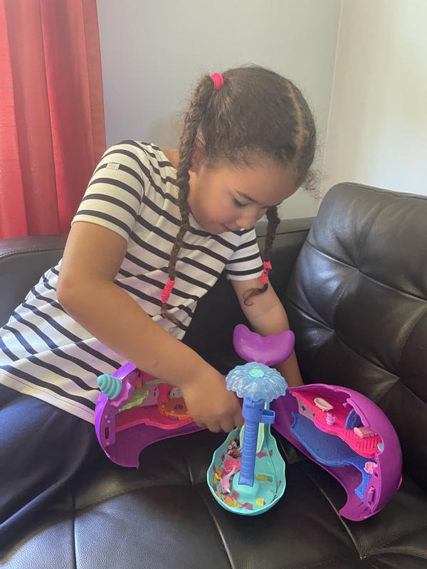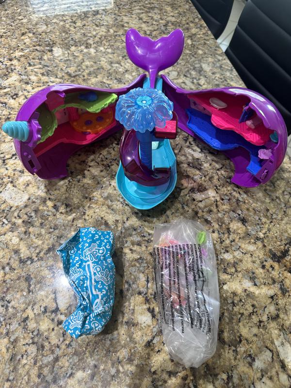 Firstly, we were surprised that this polly pocket narwhal is quite big and filled with impressive details! When you open the narwhal, the left side has a lounging dance area that rotates the figurines and then the level above that has a mini golf course with tiny clubs and golf balls. The balls can go through a windmill. So fun! The middle part is where a unique water feature is located. You can add a cup of water and push the tail (which is a lever) down and water will be pushed up the slide for your small animals (narwhal and turtles) and figurines to slide down. If you unscrew the water spout on top of the slide, pushing on the tail will produce a mist sprayed out of the top. The mist can be sprayed while the whole narwhal boat is closed as well. The right side has a bedroom upstairs and a restaurant area downstairs. My 8 year old daughter's favorite parts are the spinning dance floor, swimming area, and all the space to play in the bedroom and restaurant. In true polly pocket style, all pieces fit inside and the narwhal closes up with a latch. My child likes to bring this toy with her to share with others and pretend together. Its so cute with the ocean theme thoroughout and it is much like an amusement park - doll house. It came with 3 surprise capsules with a coating over each. We were impressed that you put these capsules in water and the paint comes off to reveal your surprise decorations.