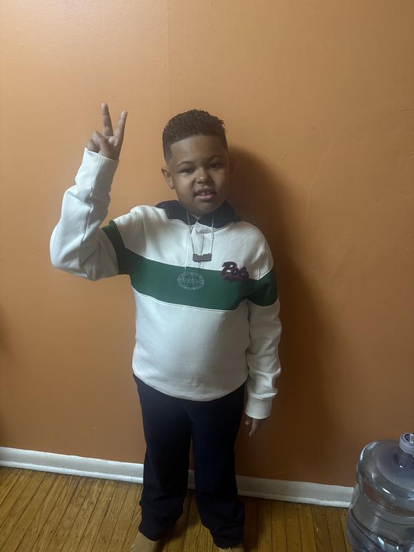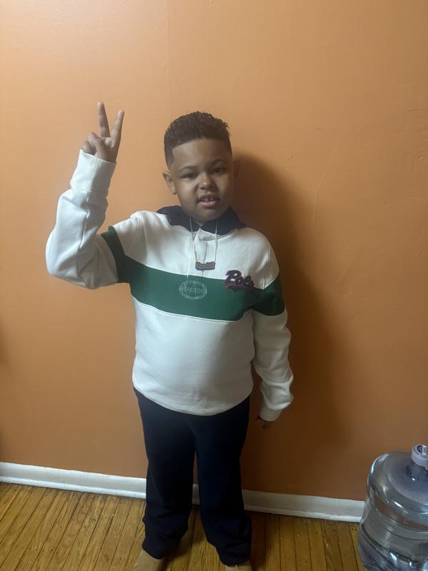 If your kid is a bit on the husky side, this may not be the item for you! The sweater has no stretch like most of Ralph's other sweaters, which makes it not ideal for someone who needs the stretch to make it roomy. Very nice sweater, looks even better in person. It's more like an off white or cream. Not solid white!