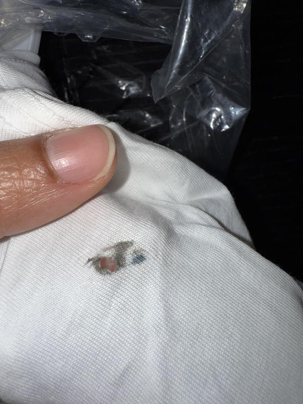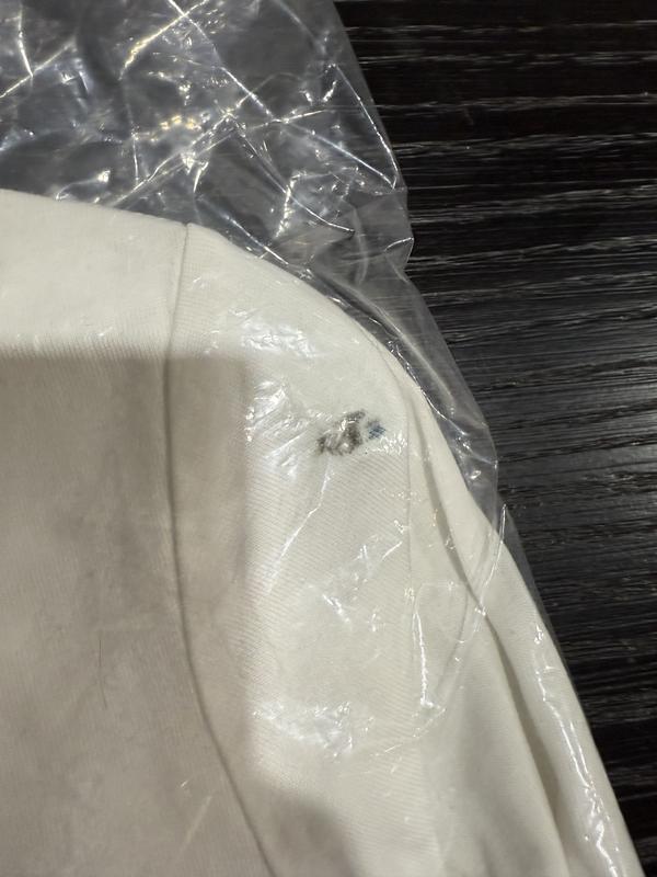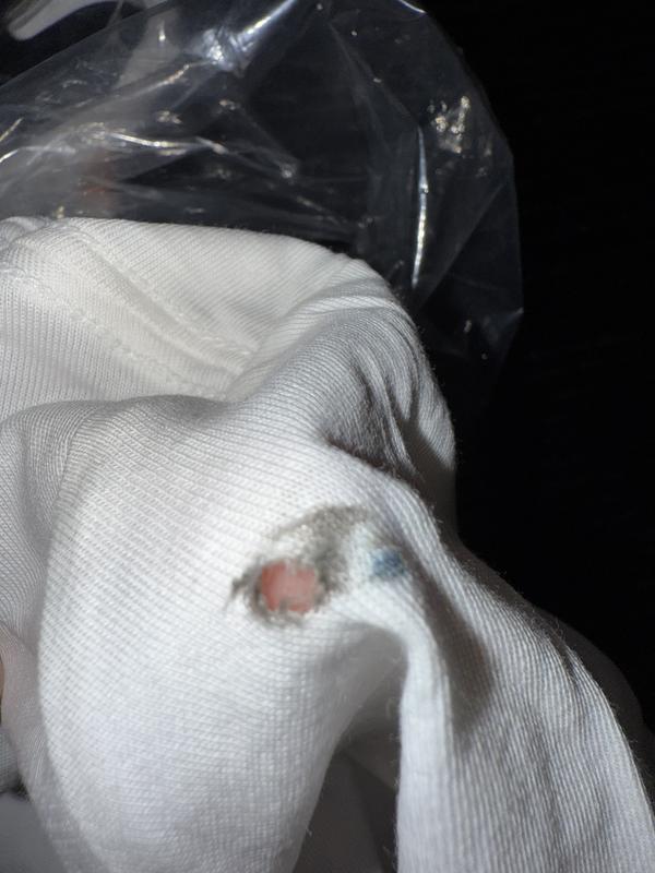 Mine came stained/damaged. The shirt had a clear plastic bag over it and once I took the bag off, I could see a small black stain in the shoulder area but once I looked closer and rubbed it, I noticed it was also a tear there. I’m not sure what is in that spot but I will be returning
