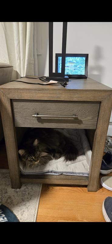 This is a nice sized end table. The drawer is convenient for storing things such as remotes. And our cat loves that he can sleep underneath so it works as a cat bed too!