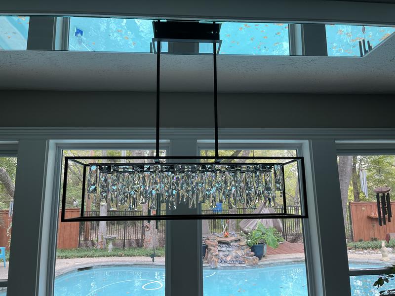 Love this light !! It’s in the dining room and we have a large window looking out into the back yard and pool. The crystals from the glass seem to catch the water and everything sparkles. Lol. Love it ! The only thing I would change would be that some of the crystals have holes to hook the wire through to hang , on both ends . I would t have done that if I was the designer but I guess they use these crystals for a lot of different lights and designs. In my opinion , at this price the crystals should be exclusive to this item . That’s the only reason I gave it a 4 star instead of 5 . We also have a mirror panel above the light and it reflects back …. Beautiful. The pic doesn’t do the light justice !! ??