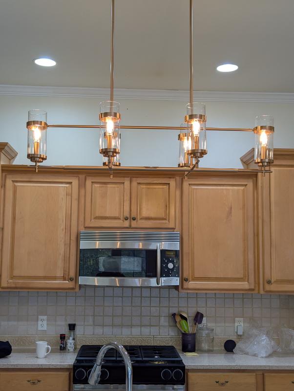 Traditional island fixture with a touch of class. Works well with my dining room dimmer switch. Nice soft gold brassy look.