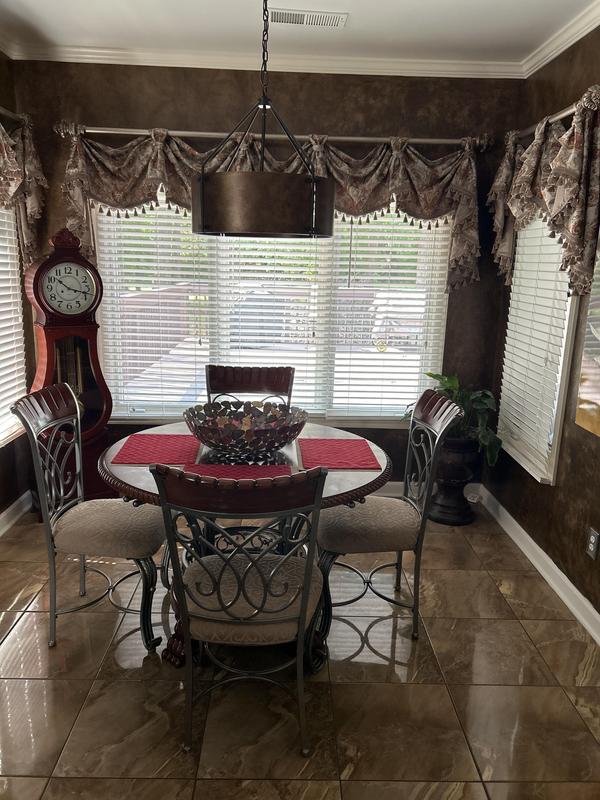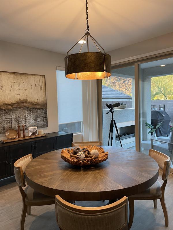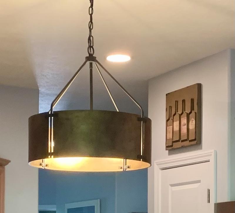 Beautiful addition to our kitchen. Its metal bronze shade with distressed markings make it feel like it was from the old industrial factory days. It casts a beautiful warm glow and really adds character to our home.